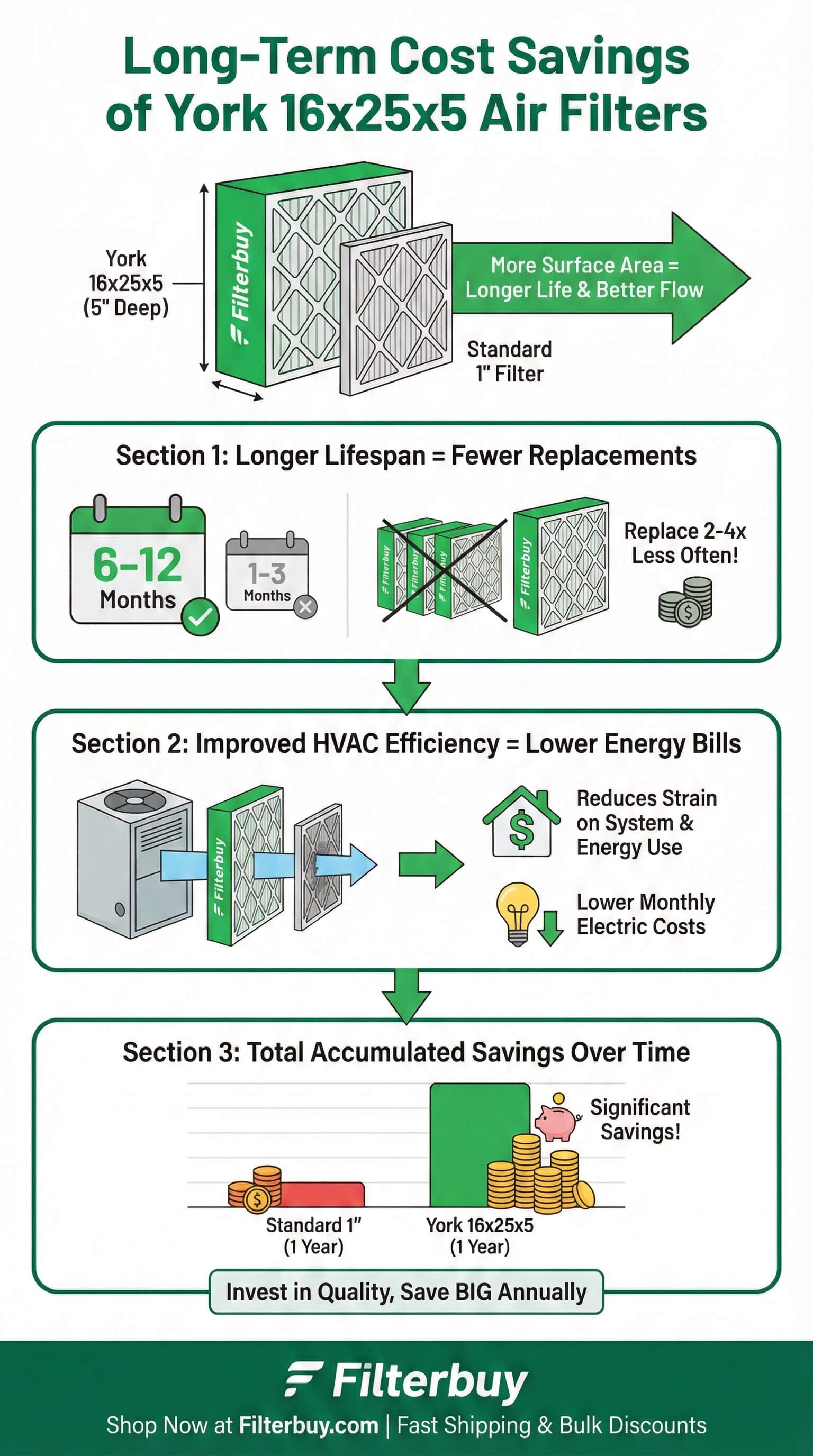 2. Bulk buying saves 38–42% per filter. A 12-month supply of York 16x25x5 filters in multi-packs costs less than a single HVAC service call.